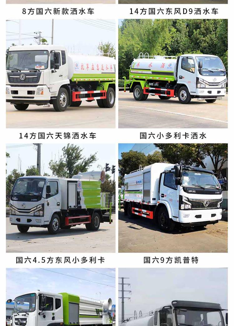 東風多利卡國六D9程力標準化12方灑水噴頭頂部配置:罐體采用4mm武鋼碳鋼板,罐體容積12立方米,罐體內隔板防波。專用自排水自吸灑水泵、前沖、后噴、側噴、后工作平臺、360度可調綠色水炮、自流閥、濾網、消防栓(取水可接消防栓,緊急可用于滅火)、罐前測量管(觀察罐內部的水位)、罐后爬梯、罐的罐口、簡易護欄、兩根泵管、雙罐面層噴漆過程中,東風多利卡國六D9程力,標準化了12個方形噴頭的可選配置:霧**機、電子水炮、箭燈。