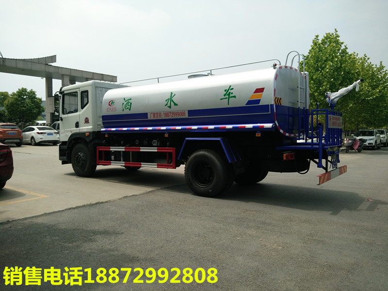 隨底盤選裝駕駛室;品名:水;密度:1000千克/立方米;有效容積:11.45立方米;外形尺寸長(mm)/軸距(mm)/后懸(mm)/罐體尺寸(長×長軸×短軸)(mm)對應關系吸程≧7米,灑水寬度≧14-16米,射程≧25-30米,引水時間<5min,流量60m3/h。前沖(噴)、后灑、帶側噴(花灑)、帶后工作平臺、平臺上安裝綠化灑水高炮(炮噴射形狀可調節:直沖、大雨、中雨、毛毛雨、霧狀、可連續調節,360°旋轉),配消防接口,自流閥,濾網,帶自吸自排功能。配備大功率專用灑水泵,泵可自吸自排,安裝過濾網,帶消防接口,可通過消防栓進水,帶自流閥,隨車選裝20米綠化卷盤,可噴灑農藥,罐體金屬漆。罐體有橢圓和方圓罐兩種,可根據用戶的要求定做。