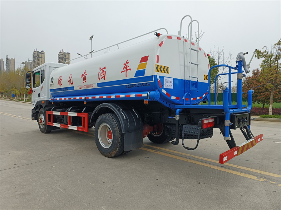 我公司產品標配前噴(鴨嘴)、后沖、后灑、側噴、后置式工作 平臺,平臺上配置綠化水炮(可 360°旋轉,既可以調成柱狀,也可 以調成霧狀,更可以調成直沖狀、大雨、中雨、小雨、毛毛雨),配 備優質大功率專用灑水泵(可自吸自排,可從河里或池塘抽水到罐體), 取力器,雜物過濾網,消防接口,自流球閥系統、取力器、球閥、濾網 均為國家標準產品,主管道加粗,法蘭墊、法蘭盤加厚,大通徑球閥。 整體具備性能優良安全可靠、效率高、流量大、維修方便等特點