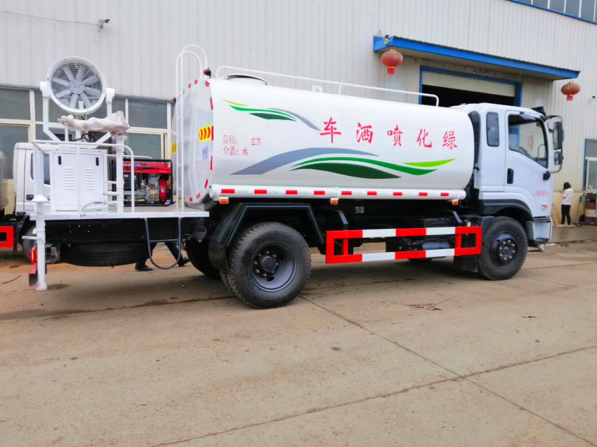 吸程7米,灑水寬度14-16米,射程25-30米,引水時間<5min,流量60m3/h。前沖()、后灑、帶側噴(花灑)、帶后工作平臺、平臺上安裝綠化灑水高炮(炮噴射形狀可調節:直沖、大雨、中雨、毛毛雨、霧狀、可連續調節,360°旋轉),配消防接口,自流閥,濾網,帶自吸自排功能配備大功率專用灑水泵,泵可自吸自排,安裝過濾網,帶消防接口,可通過消防栓進水,帶自流閥,隨車選裝20米綠化卷盤,可噴灑農藥,罐體金屬漆。罐體有橢圓和方圓罐兩種,可根據用戶的要求定做,前橋5噸,后橋10噸,康明斯190匹馬力國五發動機,法士特8檔變速箱,ABS,空調