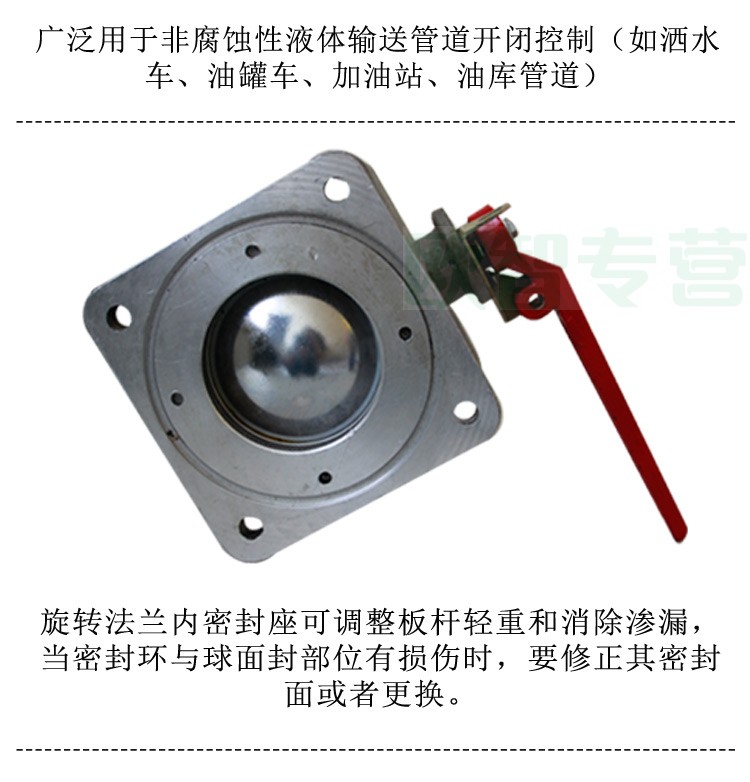 綠化灑水車配件-直通球閥 直通球閥又稱二通球閥,方法蘭,鋁合金產(chǎn)品,防腐防銹。直通球閥用途:廣泛使用在灑水車,油罐車,化工車,消防車等專用汽車上直通球閥型號(hào):DN50,DN65,DN80,DN100。直通球閥特點(diǎn):球閥采用鋁合金殼體,不銹鋼球芯,具有材料配制合理結(jié)構(gòu)緊湊,重量輕,體積小,使用方便等優(yōu)點(diǎn),設(shè)有限位和加鎖裝置,安全可靠。直通球閥調(diào)整:旋轉(zhuǎn)法蘭內(nèi)密封座可調(diào)整板桿輕重和消除滲漏,當(dāng)密封環(huán)與球面封部位有損傷時(shí),要修正其密封面或者更換。