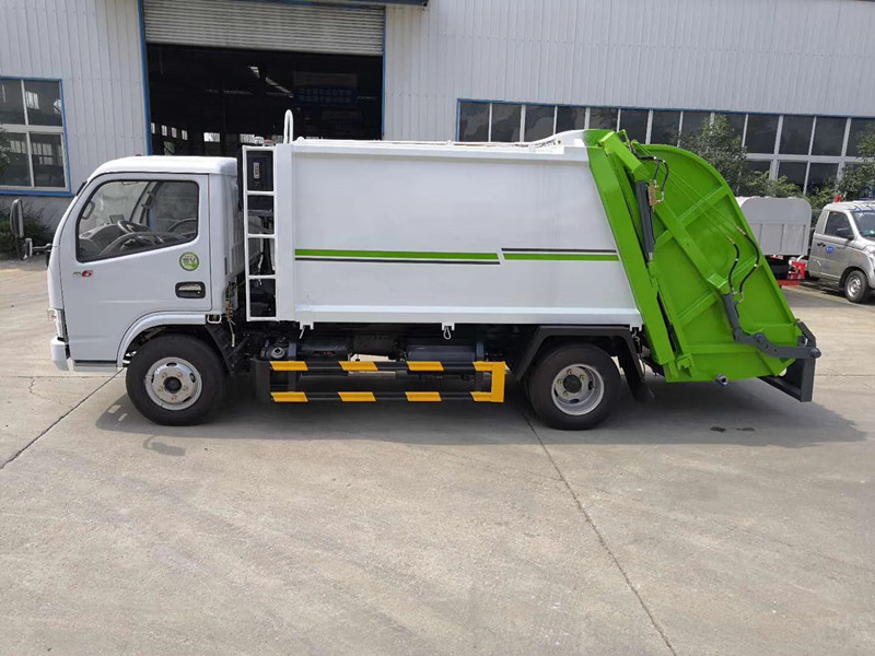 東風小多利卡側裝壓縮式垃圾車:單排可翻轉駕駛室側裝壓縮掛桶對接式垃圾車,3300軸距,東風輕型發動機廠生產的D28D11-4DA發動機(仿五十鈴技術)銘牌功率75(kw),193變截面車架,2噸前橋,4噸后橋,7.00R16鋼絲胎,12伏電池,無空調,有動力轉向,液壓制動。