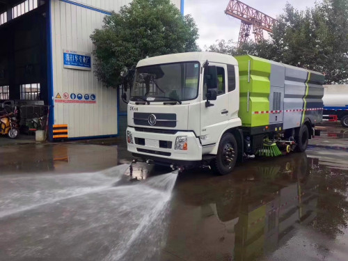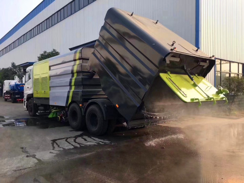 該洗掃車采用東風(fēng)天龍二類底盤改裝,加裝副發(fā)動(dòng)機(jī)、風(fēng)機(jī)、清水箱、垃圾箱、左右立掃、掃盤降塵系統(tǒng)、左右高壓側(cè)噴高、吸盤內(nèi)置高壓主噴桿、氣動(dòng)系統(tǒng)、液壓系統(tǒng)、專用裝置電控系統(tǒng)和副車架等改裝而成,