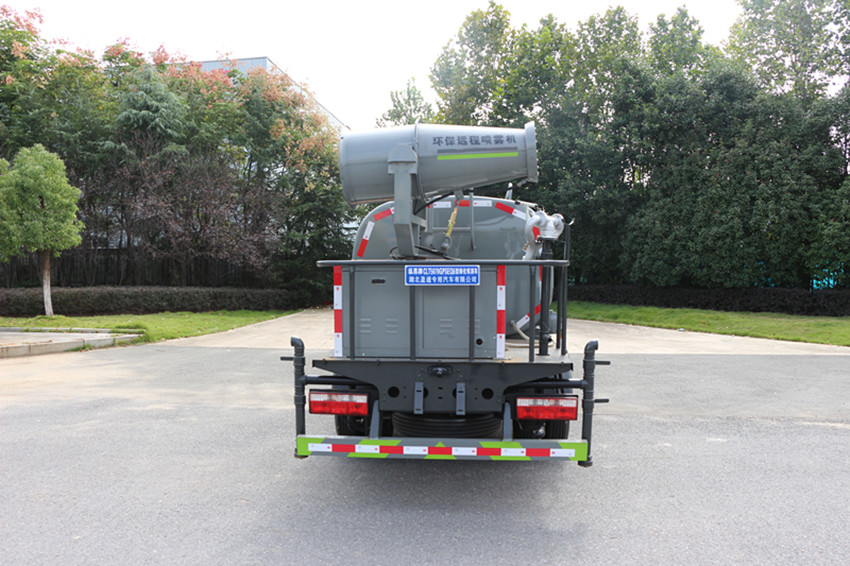 灑水車具有前沖、后灑、側噴(更換噴頭后變為側花灑)、后置式工作平臺(帶踏梯,四周有安全護欄)、平臺上設置有高壓水炮(可360°旋轉,可調成柱狀,射程28米;也可調成霧狀,射程14米,可連續調成:直沖狀、大雨 、中雨、小雨、毛毛雨),整車灑水寬度大于14米。配備優質大功率專用灑水泵,取力器,雜物過濾網,國標通用65型消防接口(可通過消防栓加水 )、1套自流球閥系統(可自吸自排,吸程6米),2根引水鋼絲膠管 (帶陰陽快速接頭),配鎖,水位計,作業高音喇叭。兩側及后加強型保險杠,防滑爬梯,膠管儲存筒。
