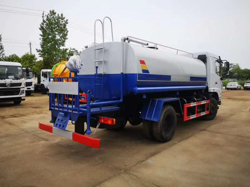 12噸灑水車上裝配置:東風國六12噸東風F5灑水車,配備國內大功率灑水車水泵,可自吸自排,引水時間<15min,流量40m3/h,揚程35米。其它部分標配為:前沖、后灑、側噴、后工作平臺、360度可調節綠化水炮,水泵垂直吸程≧7米,前沖灑水寬度≧14米,綠化水炮射程≧35米,自流閥、濾網、消防接口(可連接消防栓取水,可作應急消防用)。罐前量管(觀察罐內水位)、罐后爬梯、罐上罐口帶簡易護欄、罐側雙炮筒、6米長4寸鋼絲塑膠管兩根,罐體表面雙層油漆工藝,防銹、耐腐蝕,其余有廠家標配。
