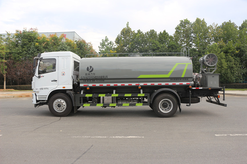 12噸多功能抑塵車主要用于城市抑塵,專用裝置為抑塵霧炮;罐體有效容積11立方米,前伸570mm, 整車外形長/前伸對應關系(mm):7600/0,7760/0,8170/570,8330/570;罐體尺寸(長×寬×高)mm: 4130×2360×1460;2.側、后防護材料為Q235B,連接方式:側防護螺栓連接,后防護焊接,截面尺寸 (寬×高)(mm)50×150,離地高450mm;2、僅選用軸距3950mm。隨底盤選裝駕駛室;隨底盤選裝部件布局 ,ABS系統控制器型號/廠家:J ABS/焦作博瑞克控制技術有限公司。選裝前置水泡樣式,選裝爬梯樣式, 選裝沖洗卷盤位置,選裝氣控閥開關樣式(安裝位置可變化),選裝工具箱樣式,側防護支腿選裝樣式, 選裝雙灌口,選裝S型水炮樣式,選裝工作燈,選裝圓形擋泥罩,選裝對沖樣式及安裝位置,選裝進出水口 安裝樣式,選裝雙邊高位花灑、無高位花灑、單邊高位花灑,選裝方、圓形軟管箱,選裝不帶軟管箱, 選裝注水口樣式,選裝箭頭指示燈,選裝上弧形噴霧,選裝打藥系統、高壓清洗系統、上綠化澆灌系統, 選裝前置噴嘴,選裝噴霧機組樣式; |