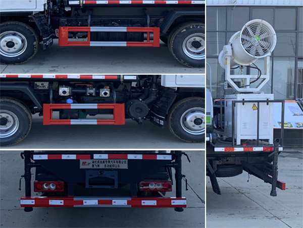 該車用途為抑塵降霾,主要裝置為水泵與風(fēng)機(jī);罐體有效容積:1.91立方米,罐體外形尺寸(mm) 為2200×1370×940;側(cè)、后防護(hù)材料為Q235,連接方式為螺栓連接,后防護(hù)斷面尺寸(mm):100×50, 后部防護(hù)離地高度(mm):350;ABS型號(hào)為CM4YL,生產(chǎn)廠家為廣州瑞立科密汽車電子股份有限公司. |