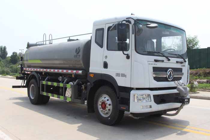 東風15噸灑水車產品標配前噴(鴨嘴)、后沖、后灑、側噴、后置式工作 平臺,平臺上配置綠化水炮(可 360°旋轉,既可以調成柱狀,也可 以調成霧狀,更可以調成直沖狀、大雨、中雨、小雨、毛毛雨),配 備優質大功率專用灑水泵(可自吸自排,可從河里或池塘抽水到罐體), 取力器,雜物過濾網,消防接口,自流球閥系統、取力器、球閥、濾網 均為國家標準產品