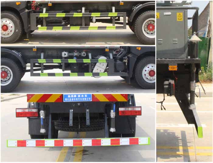 備注 | 該車主要用于城鄉園林綠化噴灑作業;主要裝置為水罐及噴灑裝置;罐體總容量:10.7立方米;罐體有效容積:10.2立方米;罐體外形尺寸(長×長軸×短軸)(mm):4800×2300×1300.ABS系統生產廠家,型號:焦作博瑞克控制技術有限公司,J ABS;襄陽東風隆誠機械有限責任公司,ABS/ASR-24V-4S/4M.側、后防護材料均為:Q235碳鋼,連接方式均為:螺栓連接,后部防護截面尺寸(mm):120×50,后部防護離地高度(mm):480.隨底盤選裝限速裝置,限速89km/h.隨底盤選裝燃油箱,電瓶,尿素罐,儲氣筒左右安裝位置,選裝噴霧裝置樣式.選裝箭頭燈裝置,選裝前部電子水炮裝置樣式,選裝前部不帶電子水炮;當前部帶電子水炮時,前伸500mm,整車長度為9100mm,8550mm;當前部不帶電子水炮時,前伸為0mm,整車長度為8600mm,8050mm.選裝罐體頂部高位花灑裝置及方形罐口,選裝尾部自流口裝置,選裝工具箱.采用底盤4500mm軸距改裝.后軸僅采用鋼板彈簧懸架. | ||