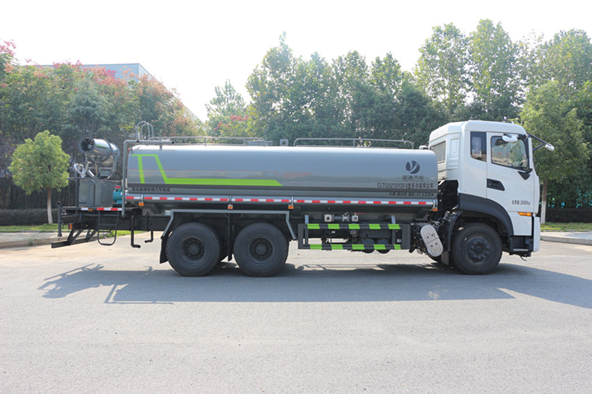東風天龍20方霧炮灑水車整車型號 CLT5254TDYDF6 型多功能抑塵車 2 發動機型號 D6.7NS6B290 3 發動機馬力/功率 康明斯 290 馬力/213KW 4 發動機排量 6700ML 5 變速箱 大同 7 檔 6 輪胎規格 295 真空胎 7 軸距 4350+1350 8 總質量 25000KG 9 整備質量 12200KG 10 額定載質量 12605KG 11 整車尺寸(長×寬×高) 10.68*2.5*3.2 12 罐體容積 23 方 13 燃料種類 柴油 14 排放標準 國六 15 水泵型號 60/90 16 罐體材質 Q235 碳鋼