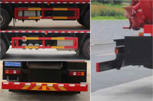 該車用于清洗吸污,主要專用裝置為罐體及清洗吸污裝置;罐體尺寸為(直段長×直徑)(mm):7100×2350(前部3150mm為清水罐,后部3950mm為污水罐);污水罐總容量14.57立方米,污水罐有效容積13.88立方米,介質:液態污物,密度:800千克/立方米;清水罐總容量11.66立方米,清水罐有效容積11.1立方米,介質:水,密度:1000千克/立方米,兩罐獨立,且不能同時滿載,清洗功能時用清水罐,吸污功能時用污水罐;隨底盤選裝駕駛室,選裝尿素罐位置,選裝罐體側部樣式及后部樣式;卸料方式為舉升后卸式;側、后防護材料均為Q235,連接方式:螺栓連接。后防護截面尺寸(mm)200×60,下邊緣離地高480mm;ABS系統生產廠家及型號分別為:西安正昌電子股份有限公司(型號:ZQFB-V),廣州瑞立科密汽車電子股份有限公司(CM4XL-4S/4M)。選裝前部不帶卷簾門保護箱。