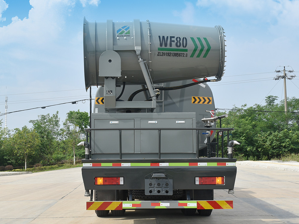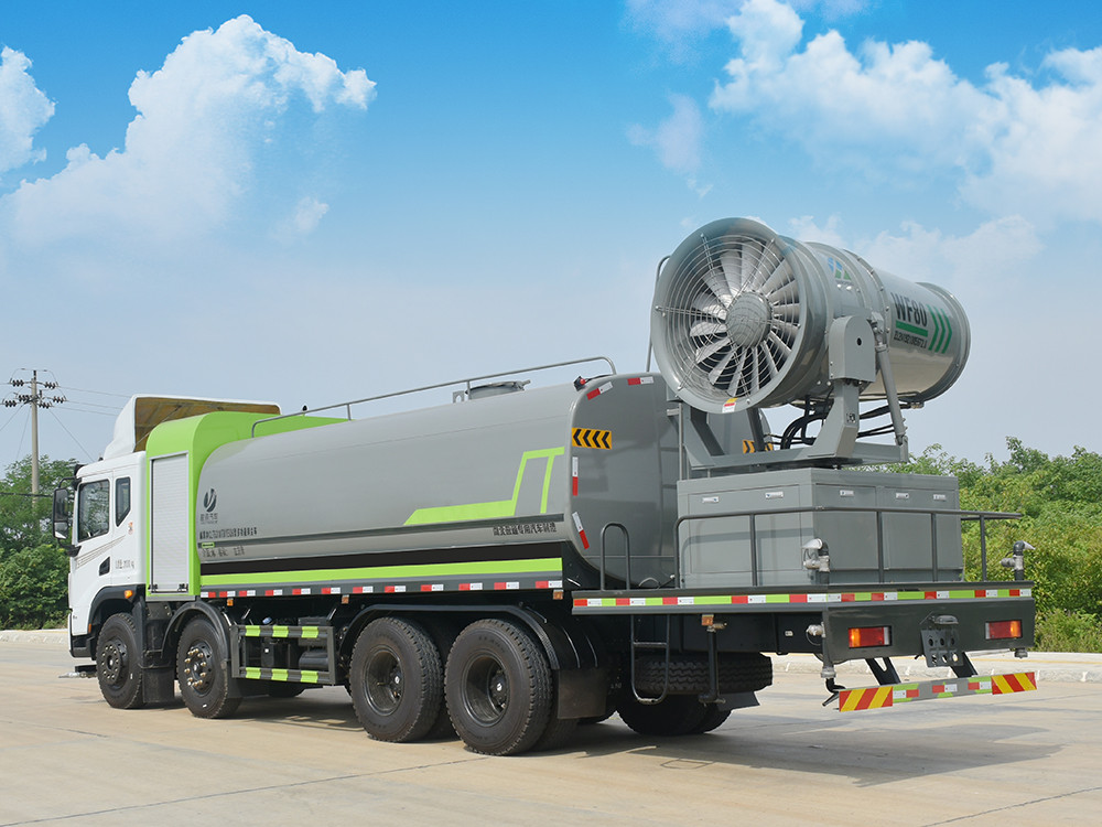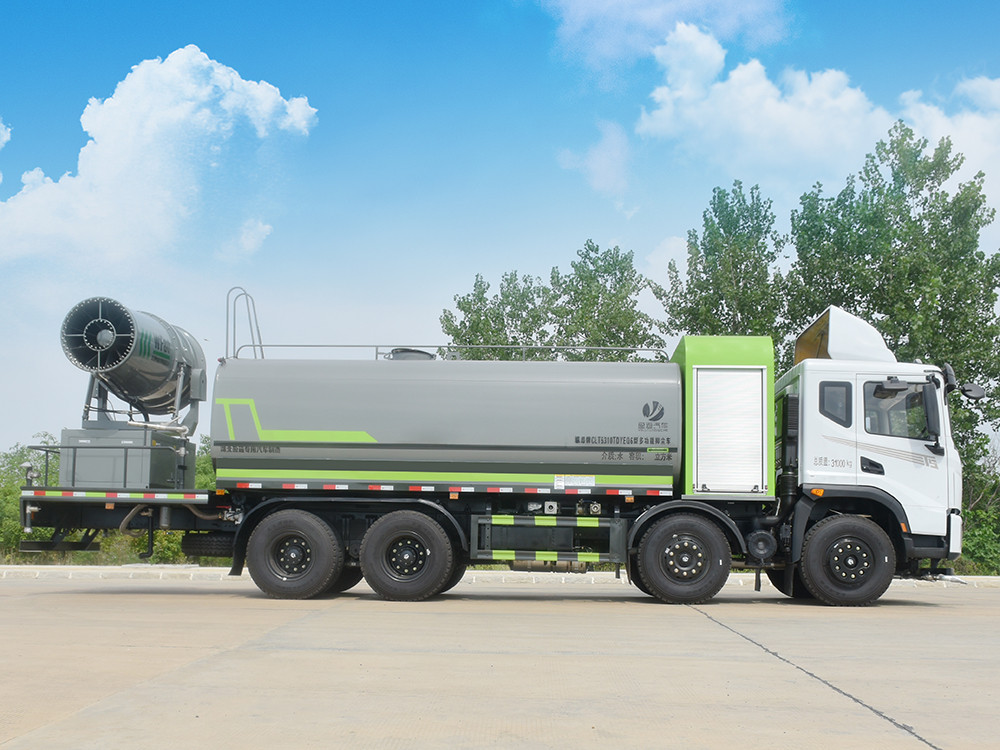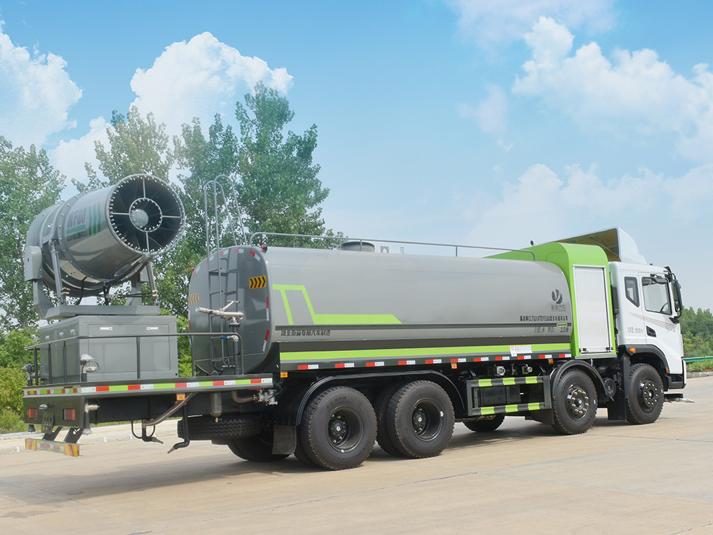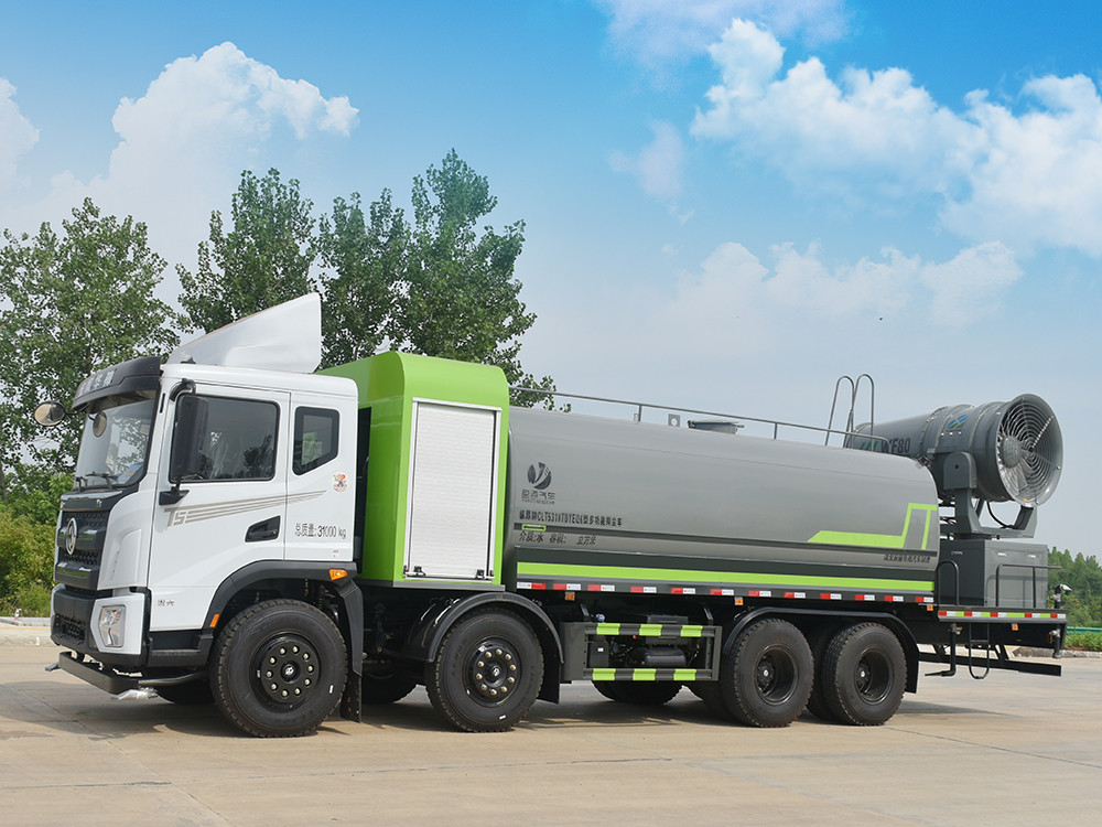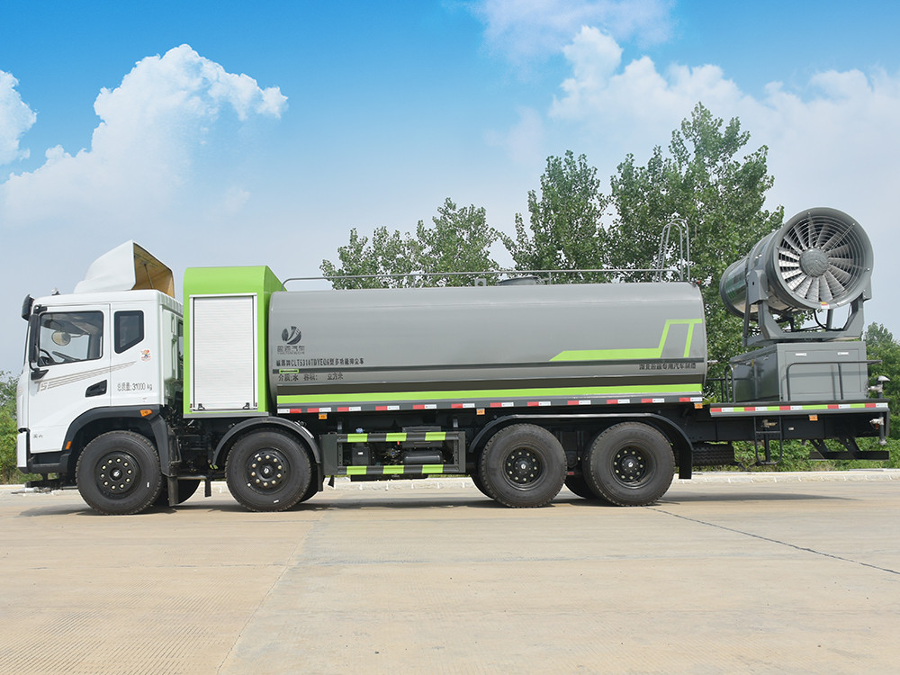 東風20噸前四后八大型霧炮灑水車產品簡述:縱昂牌 CLT5310TDYEQ6 型多功能抑塵車標配前噴(鴨嘴)、后 對沖、后灑、側噴、后置式工作平臺,平臺上配置綠化水炮(可 360°旋轉,既 可以調成柱狀,也可以調成霧狀),配備優質大功率專用灑水泵(可自吸自排, 可從河里或池塘抽水到罐體),取力器,雜物過濾網,消防接口,自流球閥系統、 取力器、球閥、濾網均為國家標準產品,主管道加粗,法蘭墊、法蘭盤加厚, 大通徑球閥。整體具備性能優良安全可靠、效率高、流量大、維修方便等特點。
