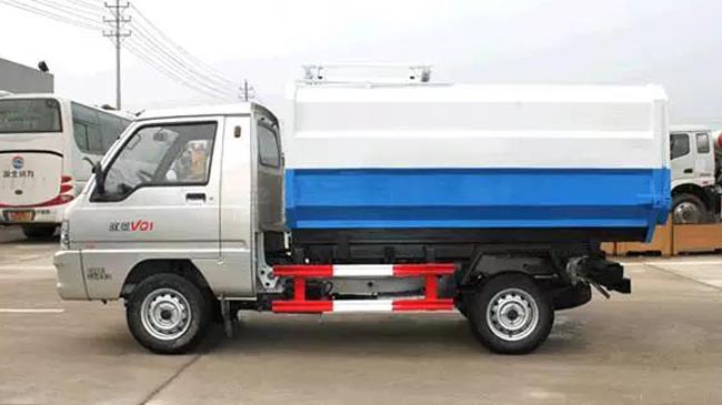 箱體容積2~3立方米,全密封式垃圾箱體,采用碳鋼邊三底四焊接制作,邊板折彎強化,箱體右側配液壓掛桶提升機,國產油泵、多路閥、取力器、油缸,卸料方式為底部雙杠液壓舉升自卸,駕駛室外操作,鐵桶掛架,后門機械鎖緊,手動開門,可選液壓開門。