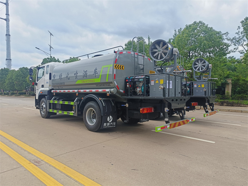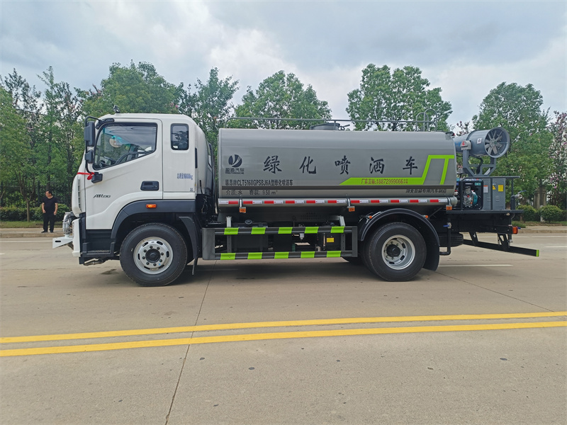 1.產品簡述:縱昂牌 CLT5188GPSEQ6A 型綠化噴灑車標配前噴(鴨嘴)、后對沖、 后灑、側噴、后置式工作平臺,平臺上配置綠化水炮(可 360°旋轉,既可以調 成柱狀,也可以調成霧狀),配備優質大功率專用灑水泵(可自吸自排,可從河 里或池塘抽水到罐體),取力器,雜物過濾網,消防接口,自流球閥系統、取力 器、球閥、濾網均為國家標準產品,主管道加粗,法蘭墊、法蘭盤加厚,大通徑 球閥。整體具備性能優良安全可靠、效率高、流量大、維修方便等特點。