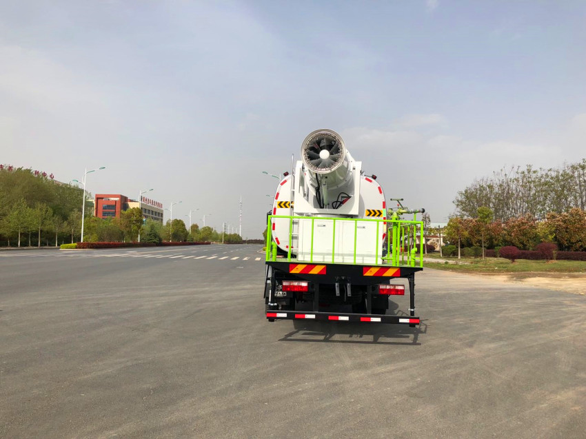 上裝配置:罐體容積為 15-18 立方多功能抑塵灑水車,選配風送式霧炮機組射程50米、60米、80米、100米、120米,罐體鋼板為4mm碳鋼Q235材質,罐內隔板具有防波作用,以減輕汽車行駛時罐體液體沖擊,罐體及整車外形尺寸按照公告。帶大功率專用灑水泵,泵可自吸自排,整車前沖、后灑、側噴、帶65消防接口,后平臺配CLW-50、CLW-60、CLW-80、CLW-100、CLW-120型風送式霧炮機組;罐體前封頭配大功率柴油發電機組;遠程遙控系統控制;霧炮機自動旋轉角度0-360°。后平臺帶綠化灑水炮,灑水炮可全方位旋轉,可連續調成直沖狀、大雨、小雨、毛毛雨;前封頭帶水位計,后平臺主管路帶1寸澆花接口,后爬梯。帶兩根輸水管及陰陽端。罐體顏色:銀/灰/綠,罐體兩側噴“多功能抑塵車”字樣,貼反光標示。