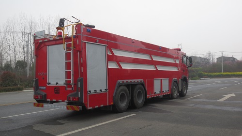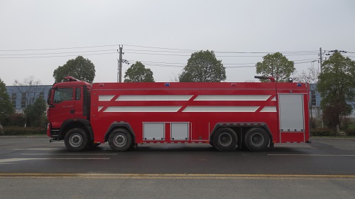豪沃24噸水罐消防車采用重汽豪沃底盤改裝,平頭排半駕駛室,液壓翻轉,整車結構緊湊,方便靈活,動力性能好,車速高,能自由進出鄉村狹窄道路及小區,具有消防車的全套消防功能,上裝箱體的上裝骨架全部采用引進歐洲技術生產的鋁合金型材制造,整車的重量減少,機動性能和整車載重量提高。除了裝備消防水泵及器材以外,還設有較大容量的貯水罐及水槍、水炮等?蓪⑺拖廊藛T輸送至火場獨立進行撲救火災。也可以從水源吸水直接進行撲救,或向其他消防車和滅火噴射裝置供水。在缺水地區也可作供水、輸水用車,主要適用于大中城鎮、鄉村狹窄街道、城市小區、繁忙的批發市場等場所的一般物質滅火,閑暇時可用于園林噴灌、道路清灑。