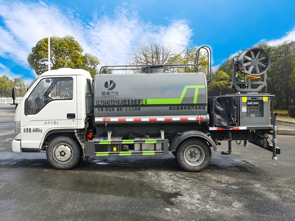 福田小卡 2.7 方抑塵車主要技術參數 序號 名稱 型號、規格 1 整車型號 CLT5045TDYBJ6 型多功能抑塵車 2 發動機型號 Q23-95C60 3 發動機馬力/功率 全柴 95 馬力/70KW 4 發動機排量 2300ML 5 變速箱 蒙沃 5 檔箱 6 輪胎規格 6.00 鋼絲胎 7 軸距 2600 8 總質量 4495KG 9 整備質量 2700KG 10 額定載質量 1665KG 11 整車尺寸(長×寬×高) 5.365*1.9*2.6 12 罐體容積 2.7 方 13 燃料種類 柴油 14 排放標準 國六 15 水泵型號 40/50 16 罐體材質 Q235 碳鋼